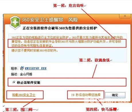闹得沸沸扬扬的“360流氓卸载金山网盾”事件中,别人关注的是国内IT界两个豪门之间的是非,其实这里面最有看头的,是学习一下360安全卫士的产品经理如何熟练的通过产品交互手段操纵用户,打击竞争对手产品。其招式之娴熟狠辣,卖相之道貌岸然,实在令人击节赞叹。