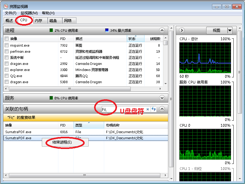 【原创】如何找到让U盘无法安全删除,文件无法删除的进程! Posted on 2014 年 6 月 21 日2014 年 6 月 21 日 by 白兔Jack 参考资料: 无法停用“通用卷”,如何知道占用u盘的程序 利用Win7资源管理器找出删除文件被占用的烦恼