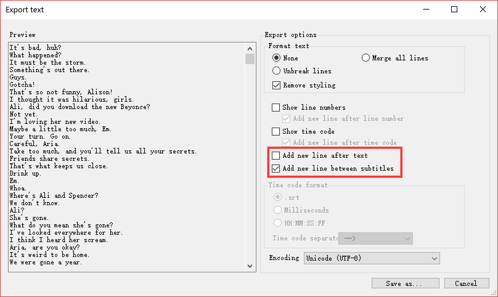 Use File menu — Open, to open an srt file, and then Use File menu — Export — Plain Text to open Export text dialog.