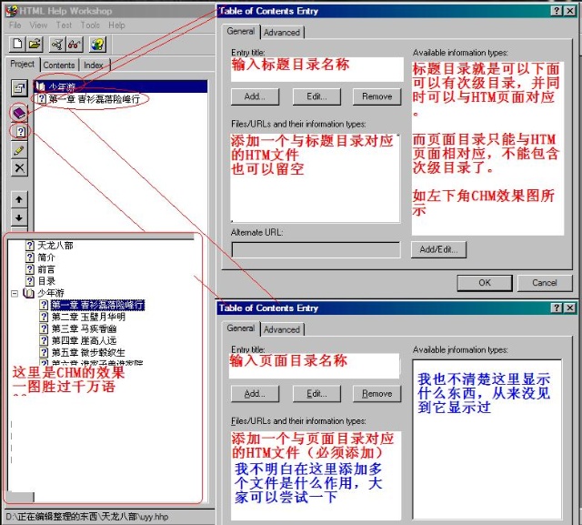 最近在学习使用Microsoft HTML Help 4.7,发现用以编辑CHM的软件并不是很多,并且大部分功能都很弱,只是简单的一个打包的过程。而Microsoft HTML Help 4.7作为官方的编辑工具,不论功能还是兼容性都应该是不错的,值得一用。可是我并没有找到关于这个软件比较详细的教程,而帮助文件又没有中文的,所以这几天全靠自己摸索,有一些心得也有许多疑问,因此写有此文,对初学者是一个小小的教程,同时希望明白的能够回答我的疑问。大家共同学习,共同进步。