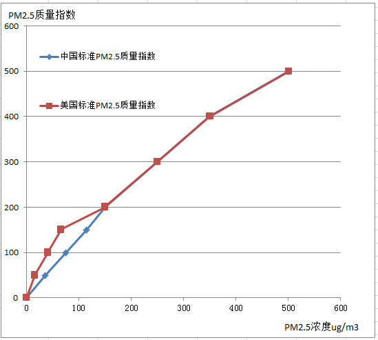 这个差异的确会导致使用美国标准(如:AQICN)发布的数据和使用中国标准(如:中国环境监测总站)发布的数据有所不同。确切的说,对于同样浓度的PM2.5,按照美国标准计算出来的空气质量指数要更大一些,但要注意的是: